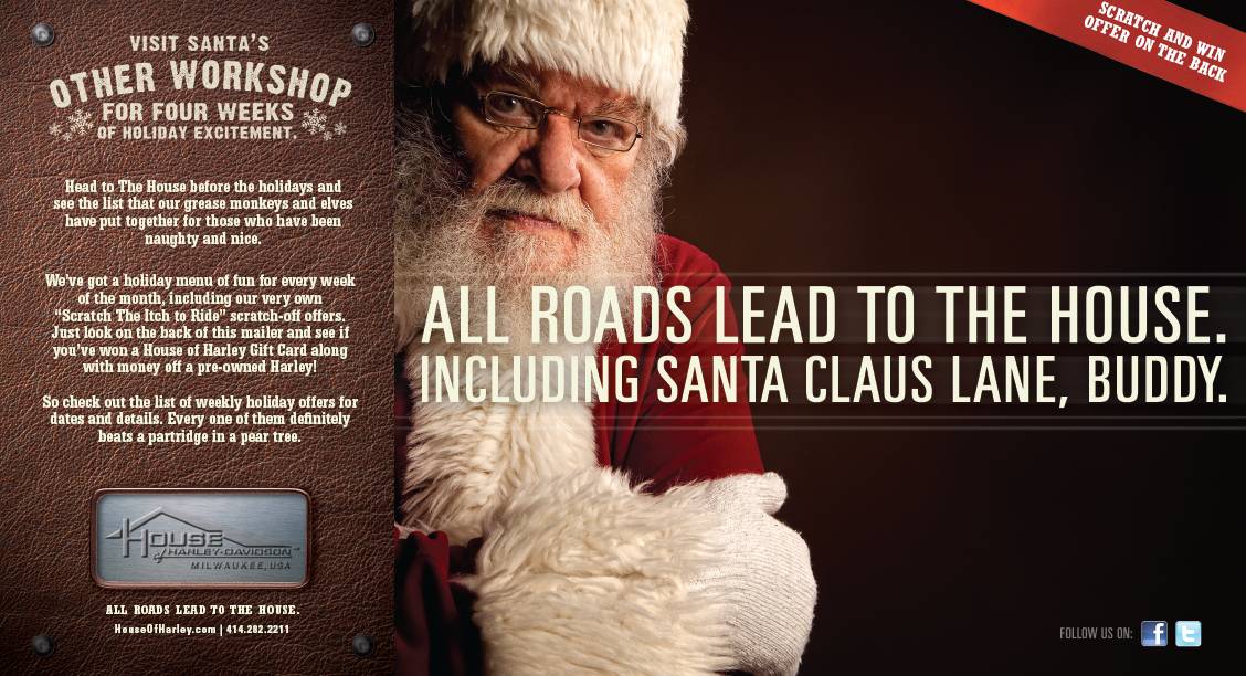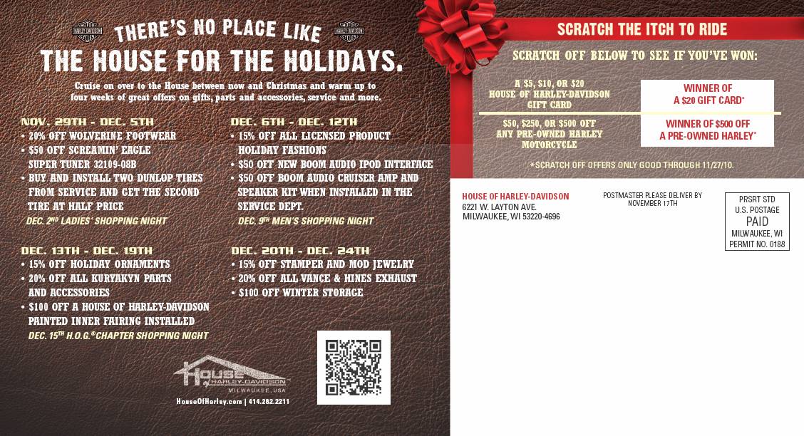 “The scratch-off concept worked incredibly well to drive traffic into the House of Harley-Davidson for pre-holiday shopping. The House sets itself apart from other Harley dealerships with our truly exceptional customer service. So driving new traffic into the store will always result in increased sales, not to mention strengthening the relationship with our loyal customer base. We also used the piece as a calendar of events for the month of December so the customers would have advanced knowledge of which events and offers were forthcoming.